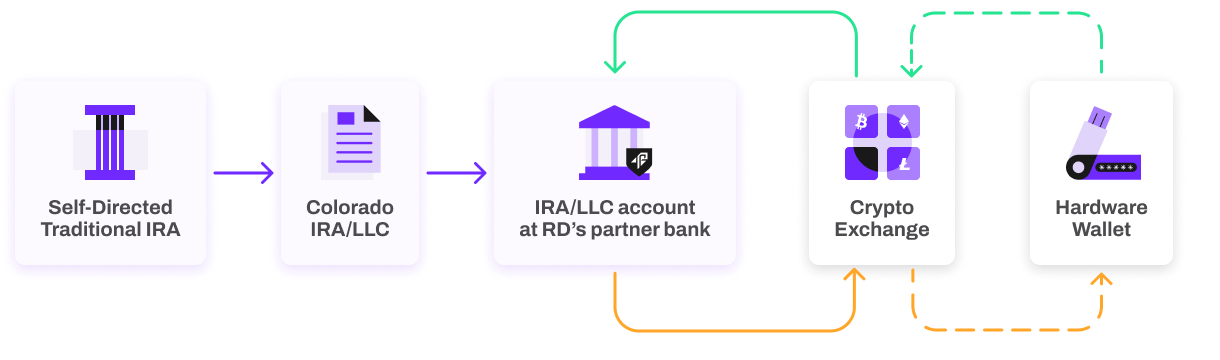 - When first investing, you must do so with fiat US retirement dollars in the name of your IRA LLC/Trust or Solo 401(k). These dollars can fund a centralized exchange account that allows private wallet withdrawals.