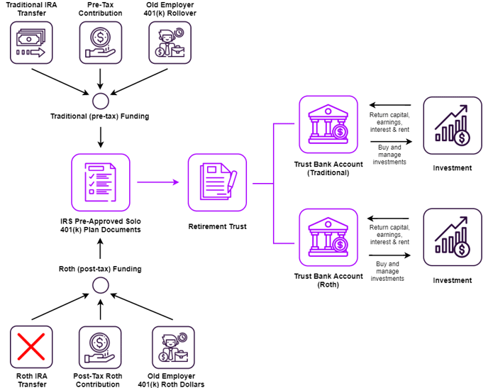 A Self-Directed Solo 401(k) can be funded with new contributions or rollovers from other qualified plans. Unfortunately, you cannot roll over Roth IRA dollars into a Solo 401(k) Roth plan.