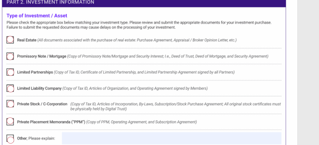 Step 6: After entering your information in Part 1, you are required to select the the type of investment and attach investment documents through the yellow paper clip button at the top of the document. Next to the investment type you will find all the required documents. Please reach out to your investment issuer to request all the required documents for your investment type.