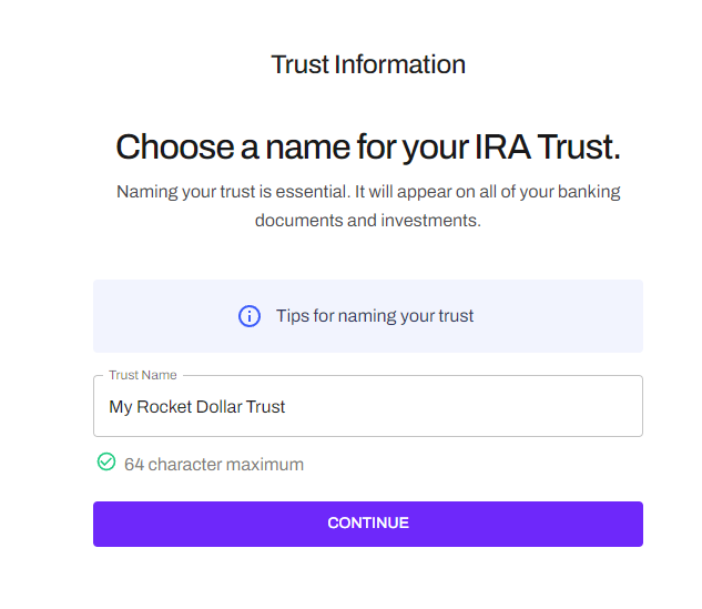 1. Please enter the desired name for your IRA Trust. If you run into any issues please contact our support team.